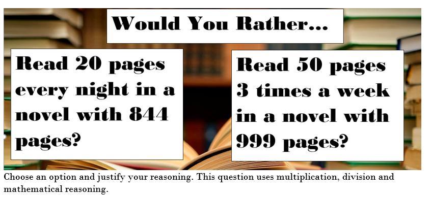 I would rather read 20 pages every night in a novel with 844 pages because it would take shorter than reading 50 pages 3 times in a week.