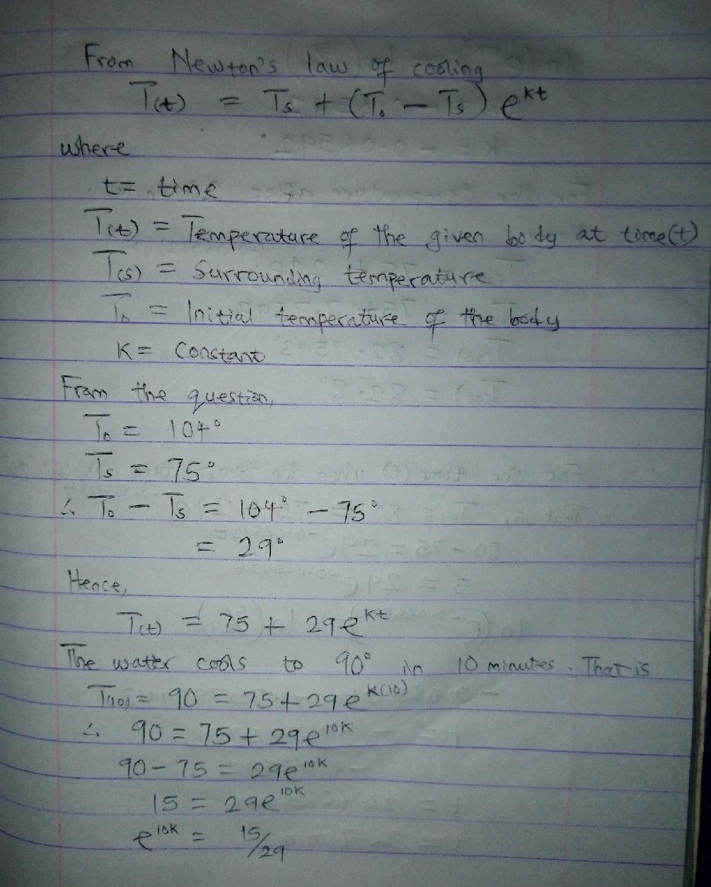 The temperature in a hot tub is 104° and the room temperature is 75°. The water cools to 90° in 10 minutes. What is the water te