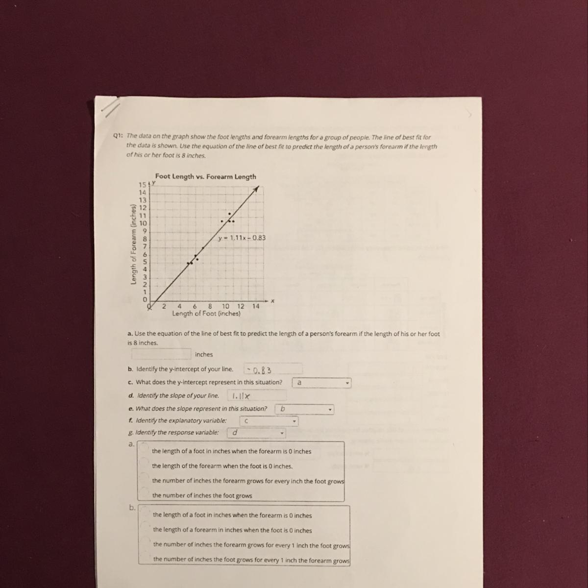 A) plug in 8 as x in the equation of the line (x-coordinate relates to length of foot): y = 1.11x - 0.83 -> y = 1.11(8) - 0.83