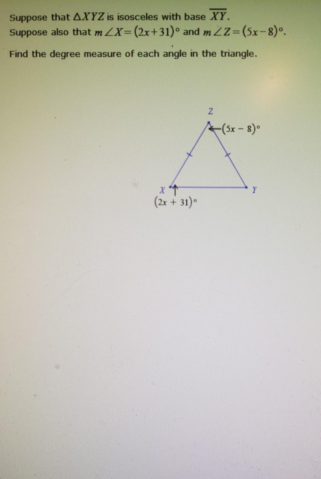 We also know that by the Triangle Angle Sum Theorem, that all the angles of the triangle add up to equal 180 degrees.