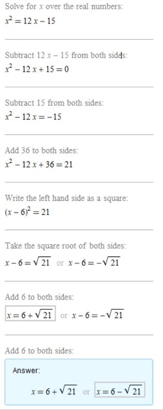 Solve x2 = 12x – 15 by completing the square. Which is the solution set of the equation?