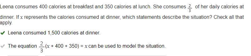 Let's let x represent the calories that Leanna consumes. Because she eats 2/3 at dinner, then her caloric consumption at dinner must be twice that from breakfast and lunch combined.