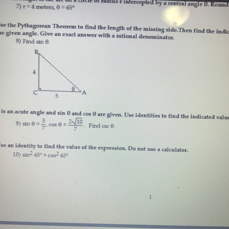 OK. Problem 9 gives you the sine and cosine of θ and wants you to determine the cosecant of θ. In order to do this, you need to remember the definition of cosecant which is simply the reciprocal of the sine. Since the sine of θ is 3/7, that means that the cosecant of θ is 7/3.