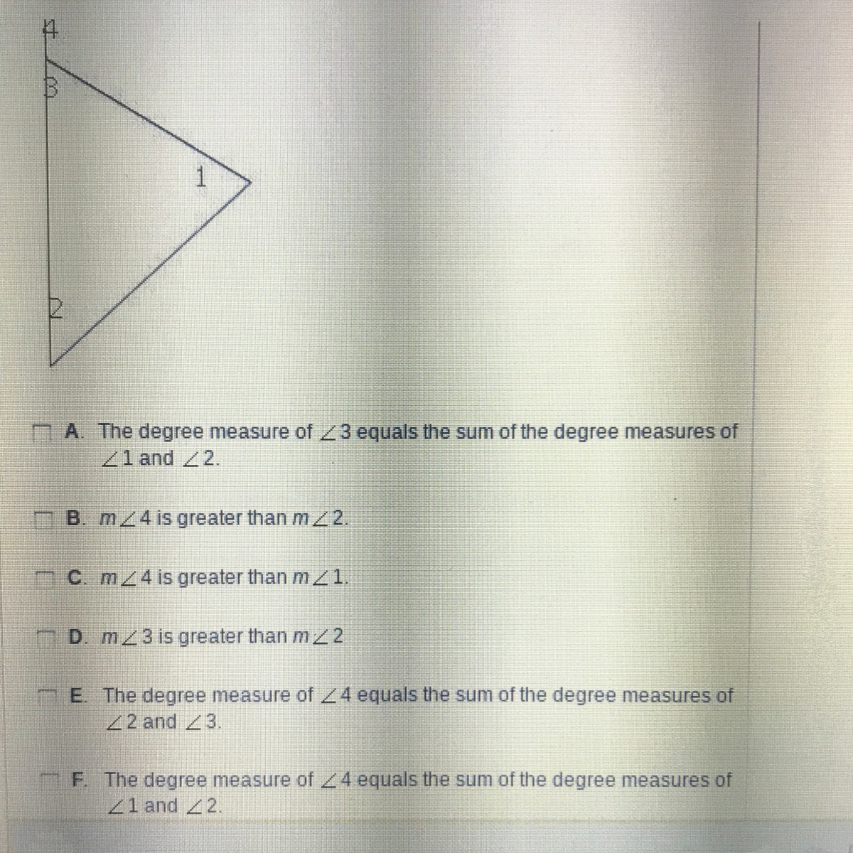 F. The degree measure of m∠4 equals the sum of the degree measures of m∠1 and m∠2