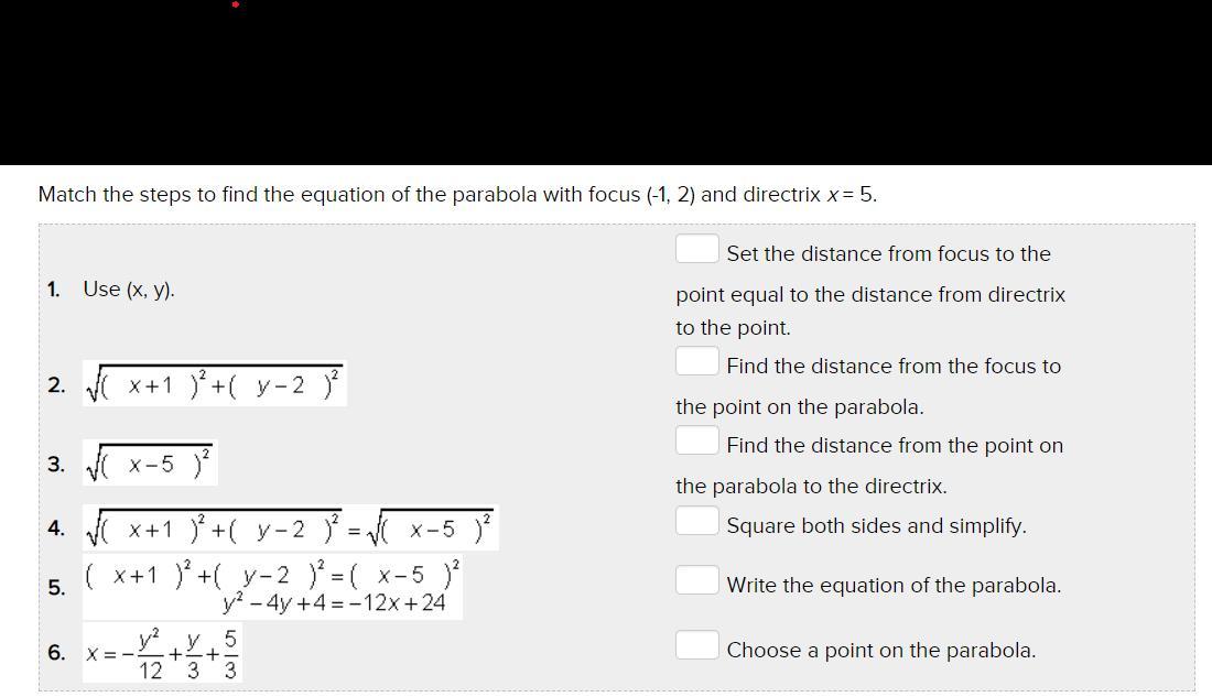 What we are doing is that we are finding the distance from the point on the parabola to the directrix . Number 5 has the fourth option or D.
