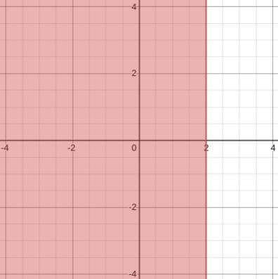 We have the function x ≤ 2. When x is the function then it's going to be a vertical stretch at a x value. In this case it says that 2 is greater then x so the line would be at the point (2, 0).