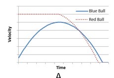 The given in this problem is that two balls are thrown at different times, different heights and velocities. A blue ball is thrown upward at a specific velocity at a lower altitude while a red ball is thrown downwards at a specific speed and at a higher height. In this case, we are asked here to describe the graph of the behavior of the balls as a function of time. The x-axis then is time while the y-axis is the velocity of the ball. The blue ball has a quadratic function while the red ball is more or less exponential. See the attached figure for reference.