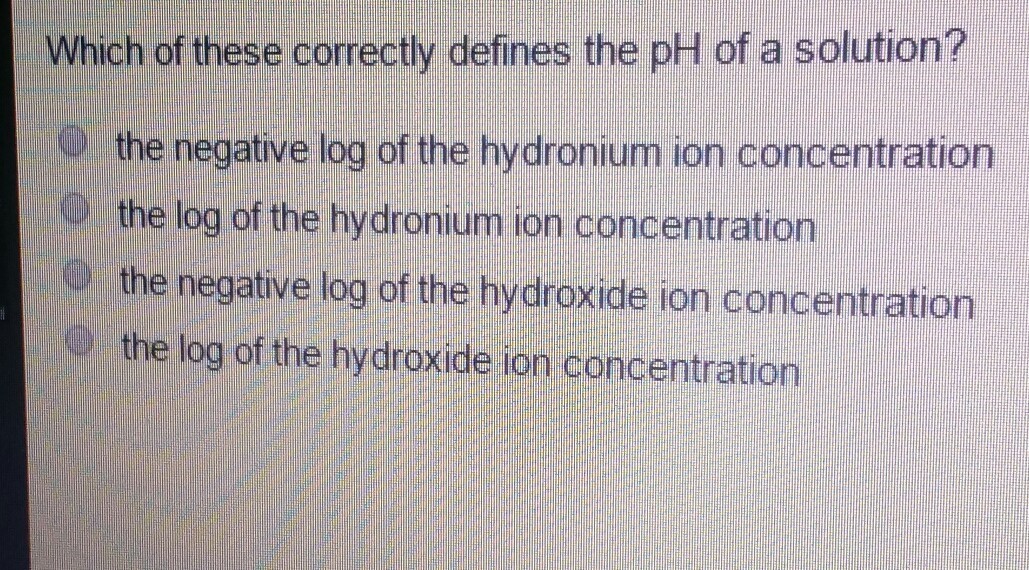 Which of these correctly defines the pH of a solution?