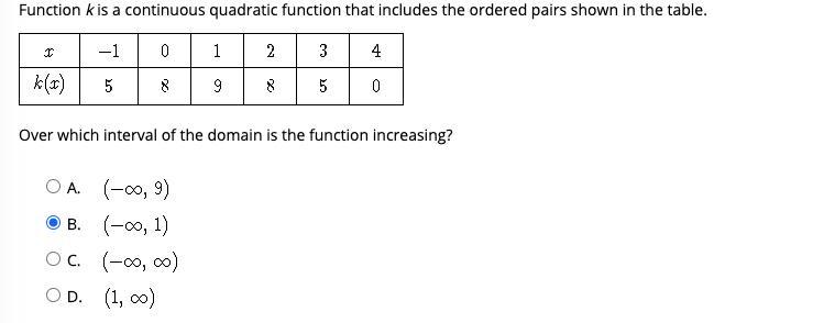 It appears to be B because this quadratic function faces down (-ax^2) and the vertex or highest point of this function is when x=1. Thus, the interval of the domain that the function increases must be from negative infinity to 1, giving the answer B.