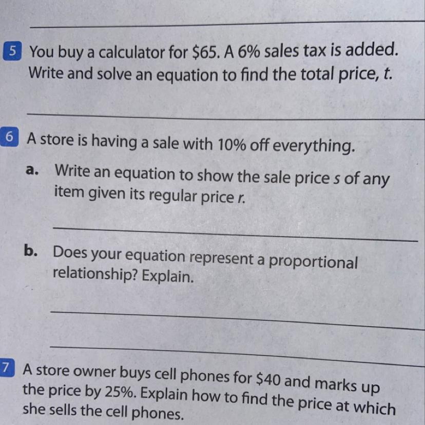 a. When there is a sale it means that there is a discount the products offered by store. Here store is offering sale on everything with 10% off, it means that the store is offering a discount of 10% on everything. We can calculate discount price by multiplying the percent discount by the original price, then subtract the result from original price. The new price is the sale price. We will have the equation: