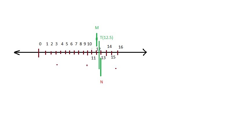 The Red dot is at point N at a distance of 12.5 units from the origin.