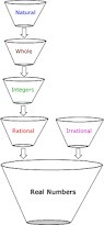 The diagram is shown in the picture. The real numbers are divided into rational numbers and irrational numbers. Example of a rational number is any fraction like 1/2, while an irrational number is one that cannot be expressed as a fraction like π. Then, integers are also part of the rational numbers which include positive and negative whole number like -5, and +4. Whole numbers are positive numbers from 0 to whatever number. Lastly, the natural numbers are whole numbers with the exception of zero. So, these are numbers from 1 to infinity.