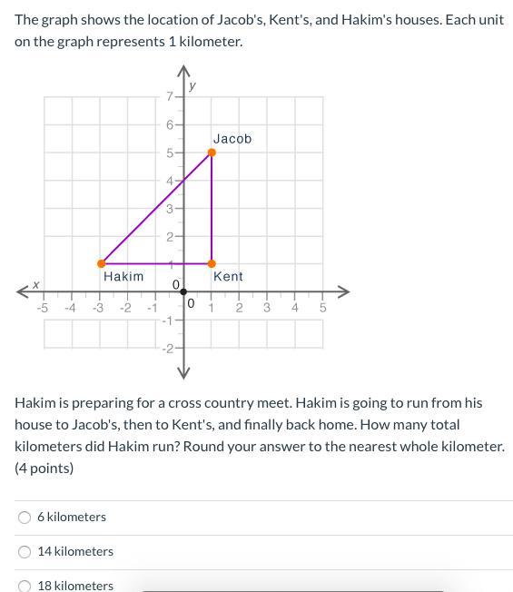 To find the first distance, use the distance formula using the coordinates (-3, 1)(Hakim’s house) and the coordinates (1, 5)(Jacob’s house)