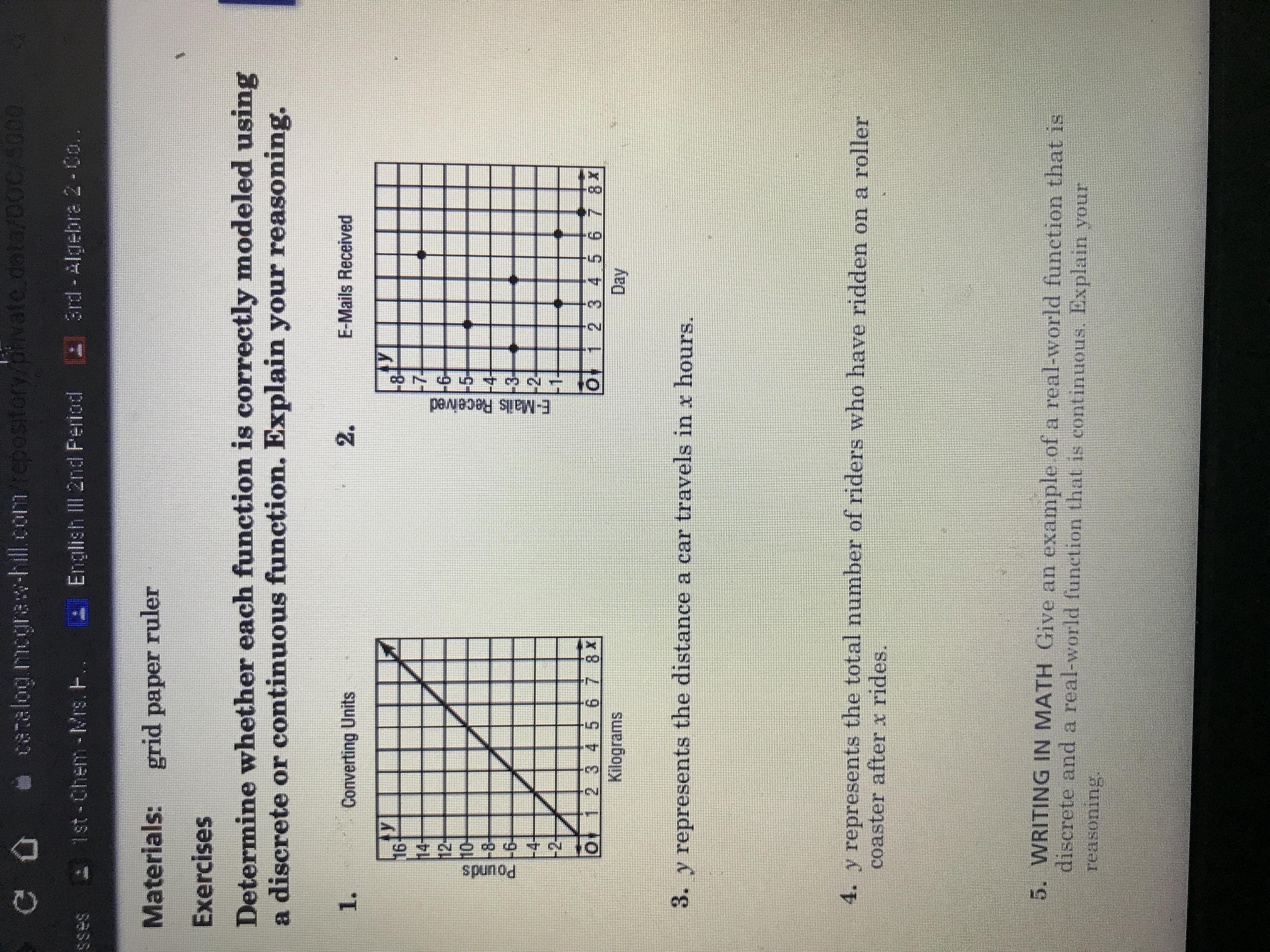 1. Converting units is correctly modeled as a continuous function as for every input of the x-variable, kilogram, there is a corresponding y-variable, pound and the graph is as displayed because to find the mass in pounds, we multiply the mass in kilogram by a constant factor equal to the slope of the graph