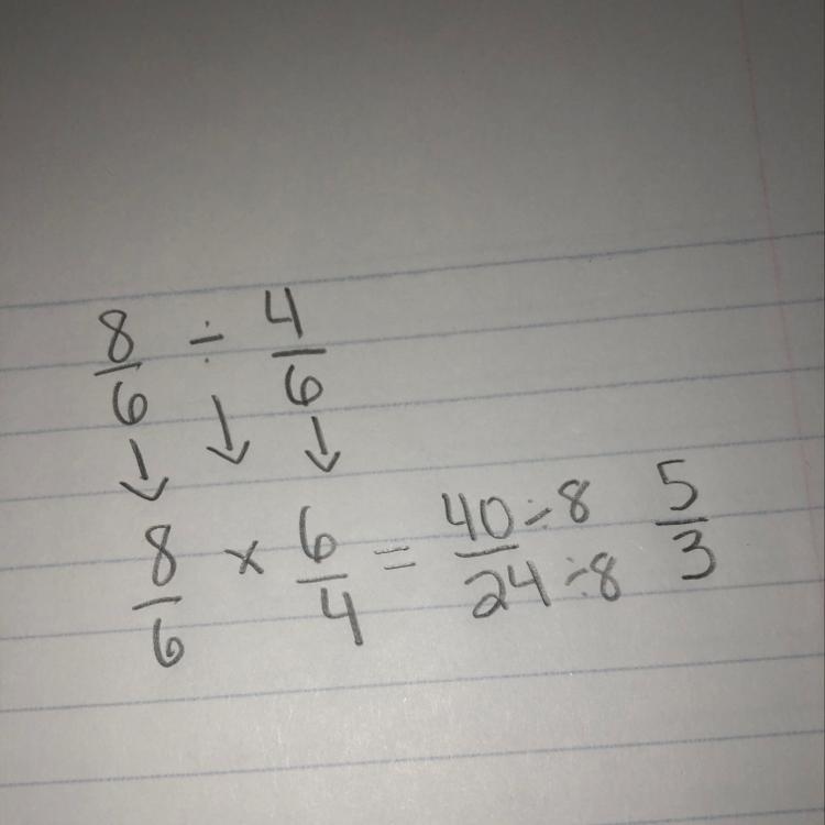 Dividing by fractions is the same as multiplying by its reciprocal. So 8/6 divided by 4/6 is the same as 8/6 times 6/4