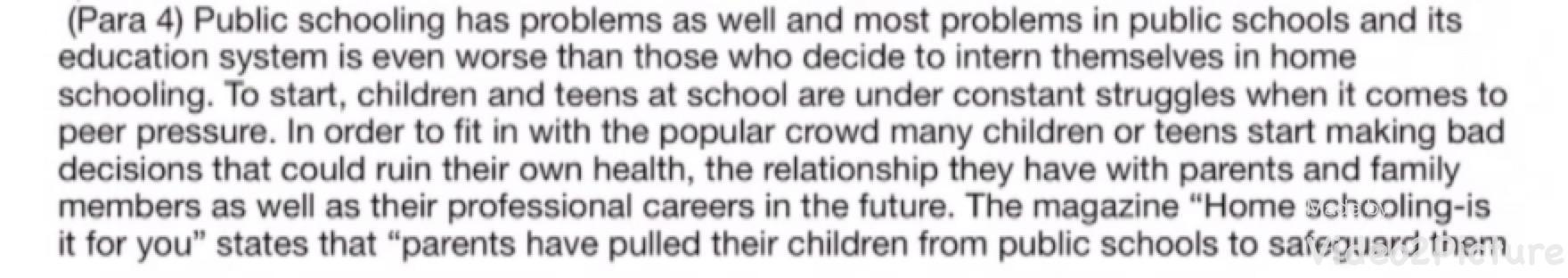 (Para 2) Homeschooling is not the best method of schooling for several reasons. Firstly, homeschooling is a challenging experience for any parent because of the change they will have to make to their lives. The CalvertEducation page mentions that parents “Will take on the duties and responsibilities of both a teacher and administrator... [they] will need to implement lessons, organize field trips, coordinate activities with other parents, and make sure [they] are compliant with state and local homeschool requirements.” Secondly, the financial situation must be considered since the cost of some resources can sometimes be very costly, CalvertEducation states “While there are many free resources available, homeschool supplies such as textbooks, books, paper, art supplies, computers, software, and other homeschool tools cost money.” Thirdly, the exposure to a social environment reduces significantly. The CalvertEducation page states that “Homeschooling... means less daily interaction with large numbers of kids in a child’s age group. And homeschoolers can end up spending less time each day participating in organized sports and activities with their peers.” A woman named Julie shared her experiences in homeschooling through her channel “Mama to five” and explained the challenges she went through growing up in such a way, Julie states: “Cons I’ve experienced being homeschooled... is only having one teacher [for the whole school-year] and of course that was my mom. [My mom would get frustrated if I didn’t get a certain subject and I feel that if someone else would have taught me the same subject she did then I would have probably understood it much better]” she later mentions that her toughest challenge was “Feeling left out [by my own] peers” It’s very important to have personal interactions with other peers. However, many home schooled kids don’t have this advantage. But, this is not always the case for each child or young adult who is in home schooling or is considering the idea of it.
