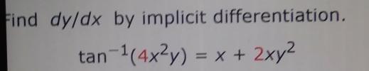 d/dx [tan⁻¹(4x²y)] = (4x² dy/dx + 8xy) / (1 + 16x⁴y²)