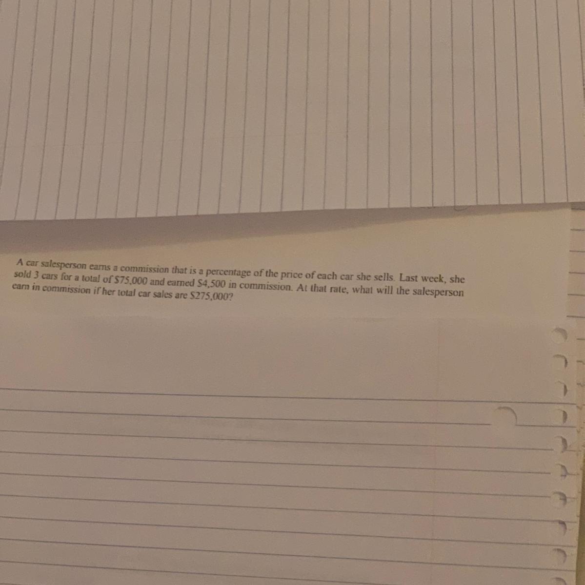 Last week she sold 3 cars for a total of $ 75000 and earned a $ 4500 commission.