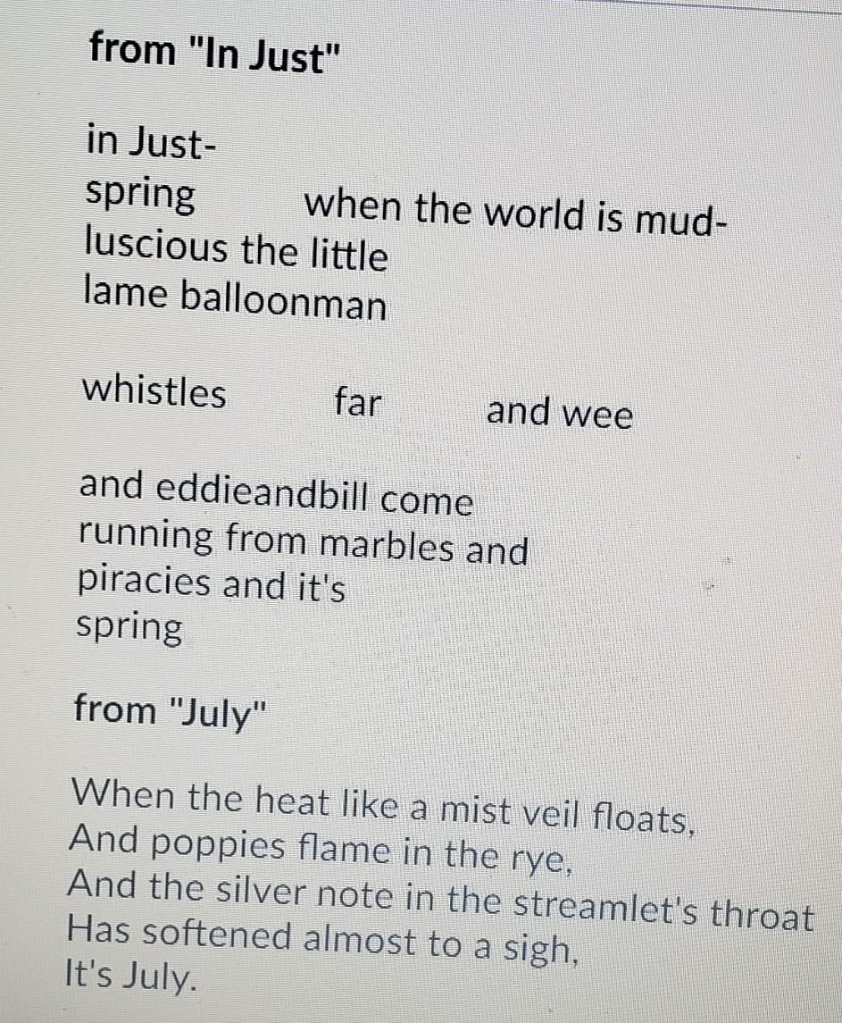 Read the passages from " In Just" and "July." In at least one full paragraph, compare the authors' use of word choice. Use evide