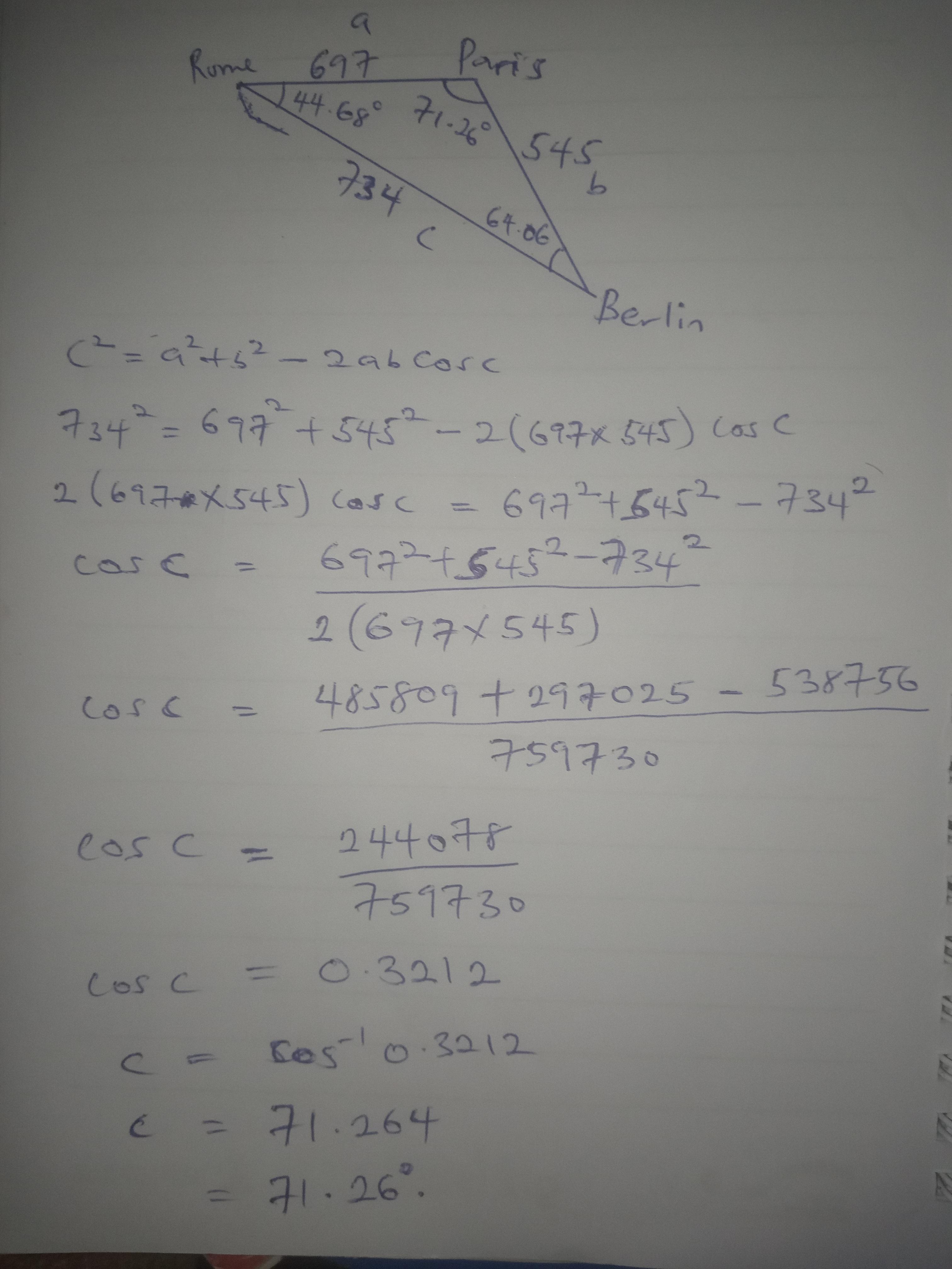 • The Angle formed from Paris to Berlin(P)=71.26 degrees