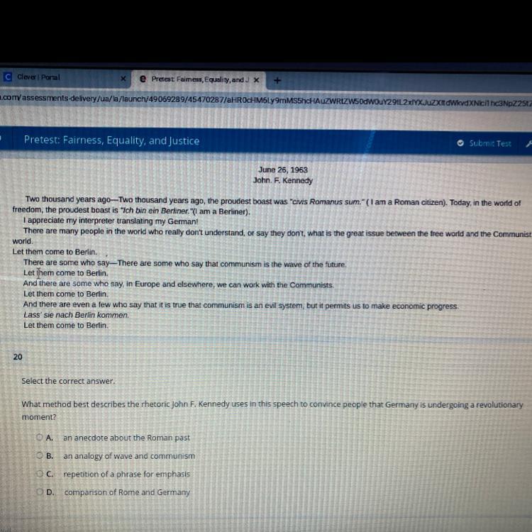 In terms of rhetoric, in this speech, Kennedy uses multiple times the phrase "Let them come to Berlin" to convey the idea communism is negative and has had negative effects on Berlin. For example, in "There are some who say that communism is the wave of future. Let them come to Berlin" the phrases emphasize communism is not a positive form of government, and has had negative effects in the city, which also suggests this situation should end. Thus, the correct answer is C.