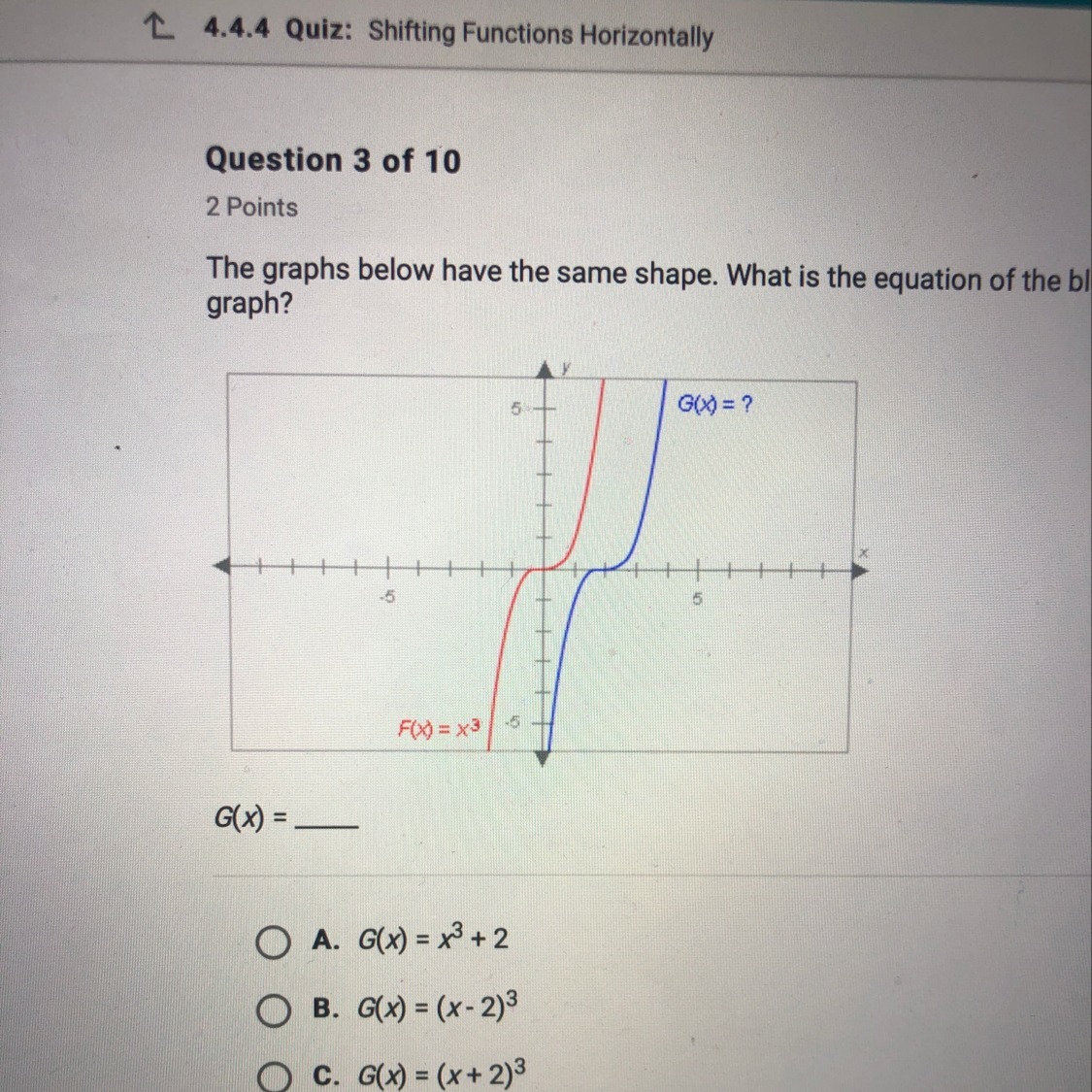 We could clearly observe by looking at the graph that the graph of G(x) ( which is represented by a blue graph) is a translation of the graph of f(x) 2 units to the right.