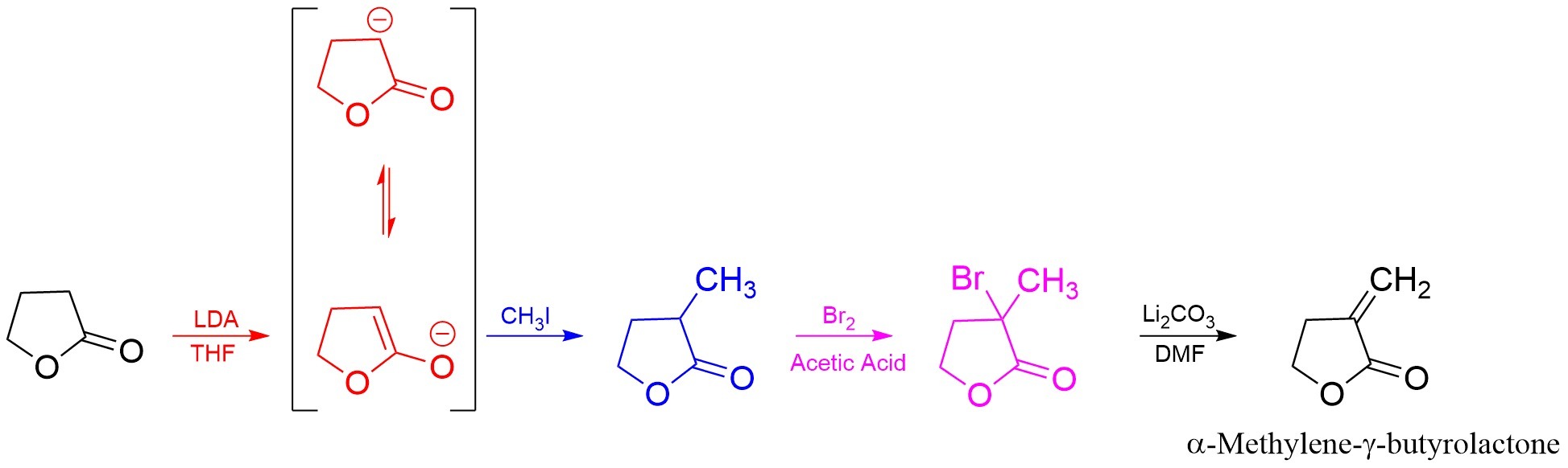 Step 1: In this step an acidic proton at alpha position is abstracted from lactone moiety and corresponding enolate is formed, which is resonance stabilized. Both structures are shown. In this case LDA (<span>Lithium diisopropylamide) acts as a base.