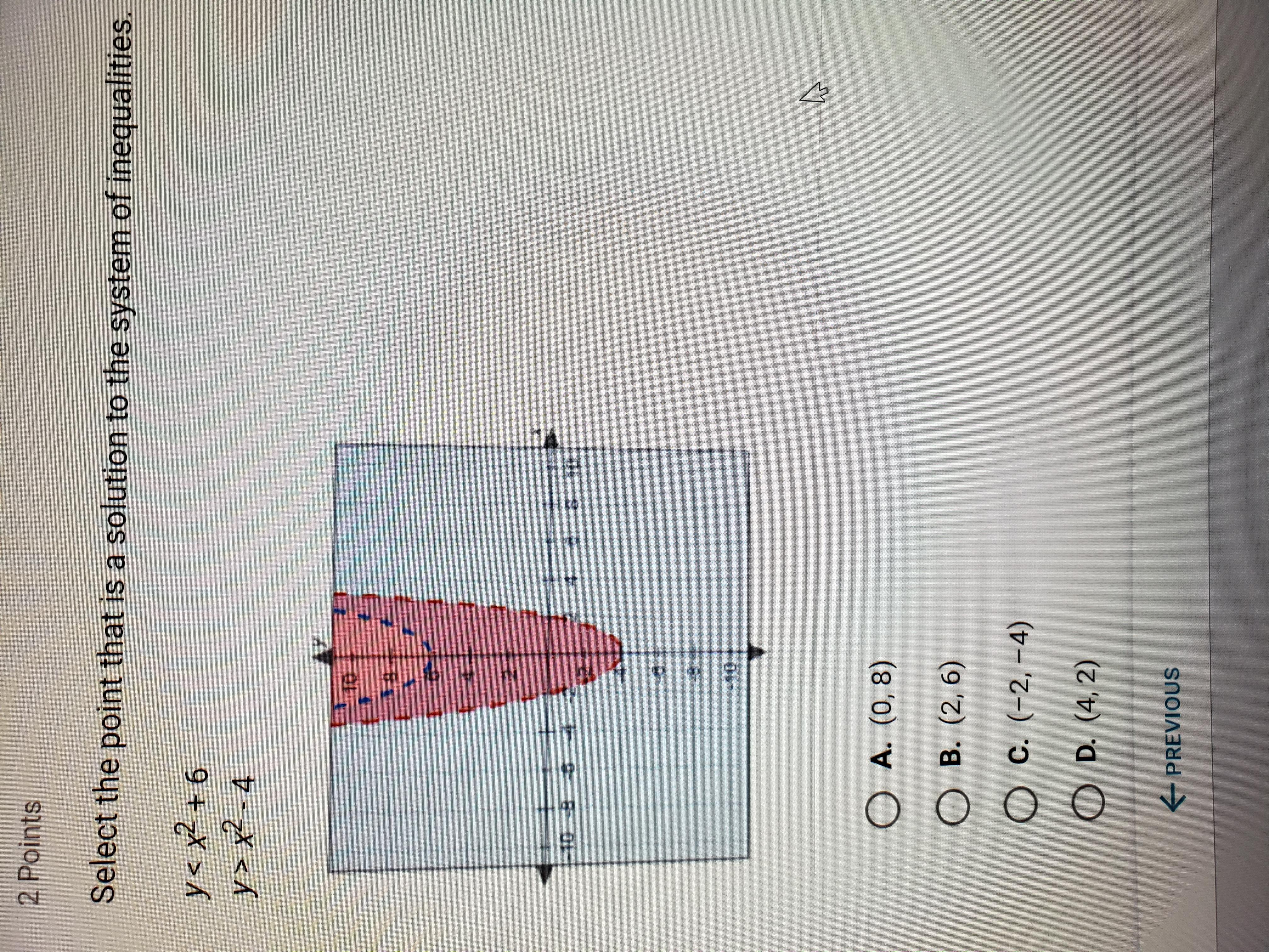 The solution of the system of inequalities is the region between the parabolas. This region is: below the parabola