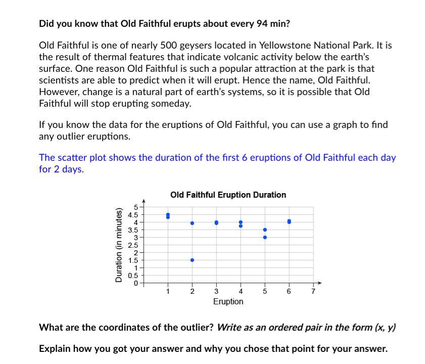 The scatter plot shows that he duration of the second eruptions lasts 1.5 minutes, whilst the duration of all other eruptions lasts about 4 minutes. So the second eruption is an outlier.