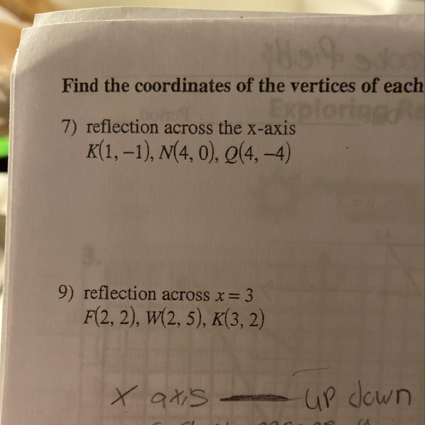 7) Reflecting across the x-axis changes the sign of the y-coordinate. That is all. Any point on the x-axis (y=0) is unchanged. The transformation is ...