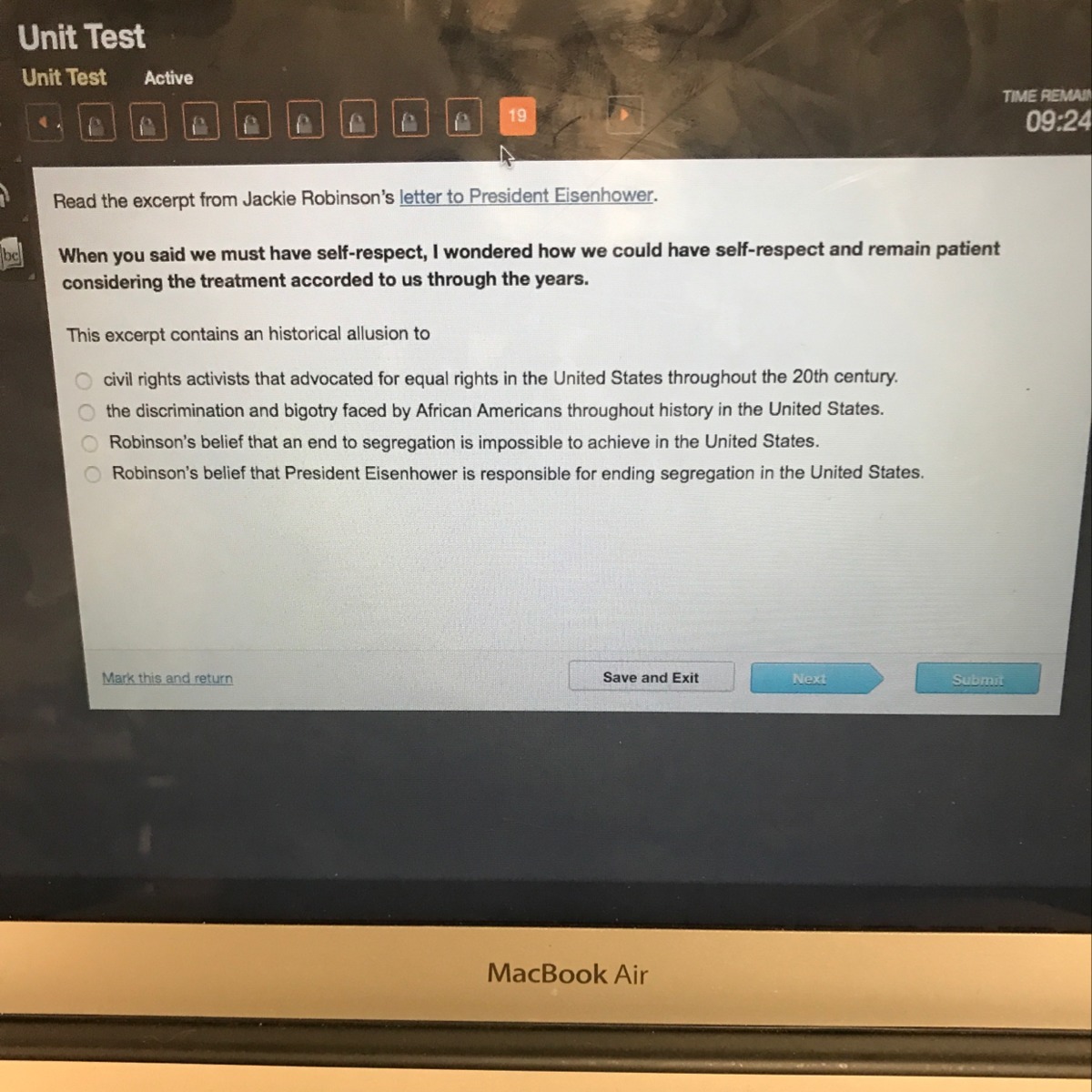 In this excerpt, Jackie Robinson references the treatment that has been accorded to African Americans throughout the history of the United States. What Robinson is referencing is the discrimination and bigotry that African Americans have had to tolerate. He implies that it is unfair to ask African Americans to remain patient after they have had to deal with all these problems throughout the years.