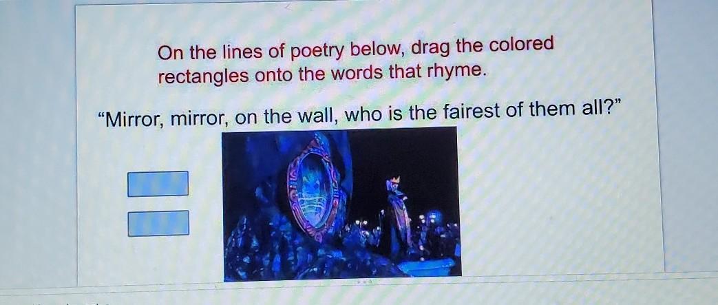 On the lines of poetry below, drag the colored rectangles onto the words that rhyme. "Mirror, mirror, on the wall, who is the fa