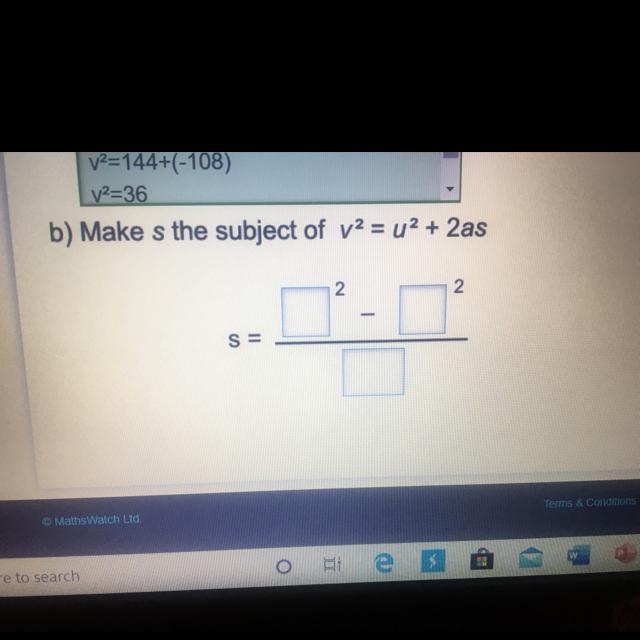 Explanation: so we start with v^2 = u^2 + 2as, and we want to get s alone on one side. first we can subtract u^2 from both sides to get v^2 - u^2 = 2as. then, we divide both sides by 2a and get s = v^2 - u^2 / 2a.