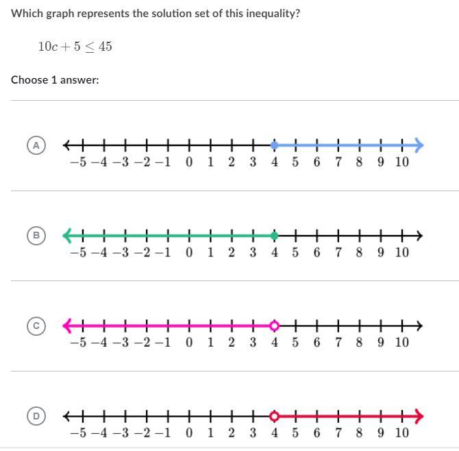 Since the inequality uses the less than or equal to sign, we use a shaded circle on the number line. Since c is less than or equal to 4, your answer will be B , since the line extends infinitely to the left of 4.
