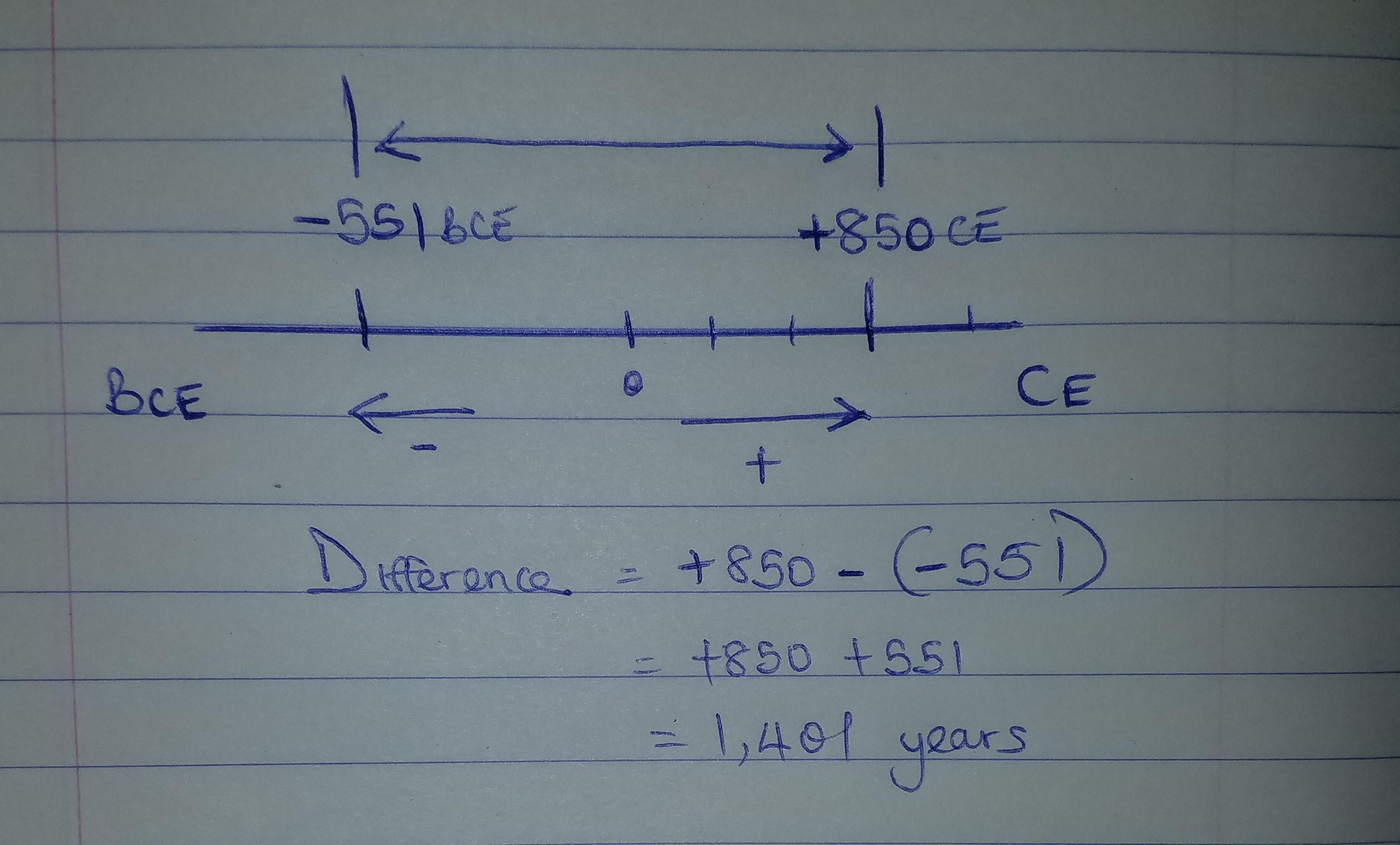 Difference in years from 551 bce to 850 ce = 551 + 850 = 1,401 years
