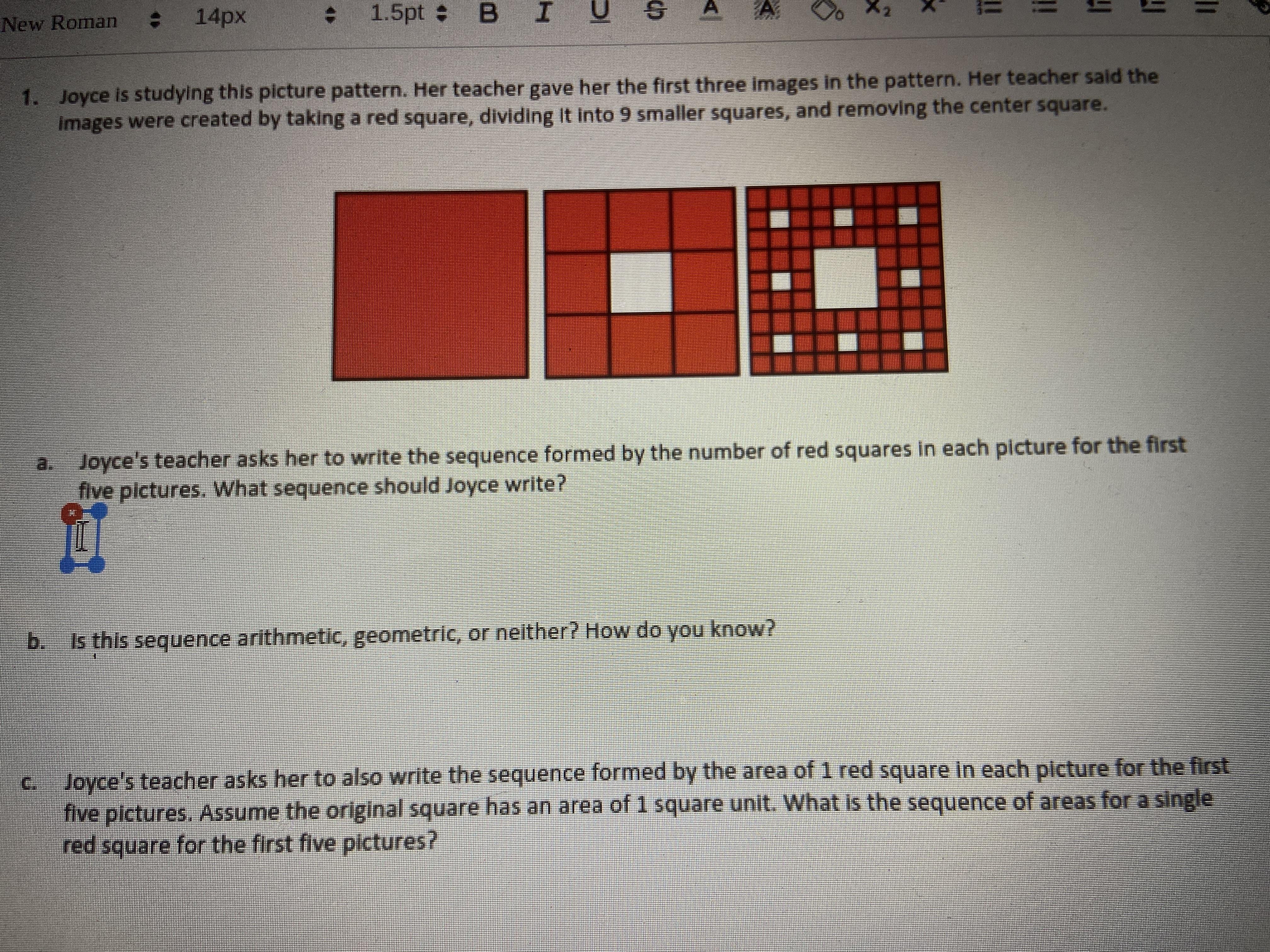 Her teacher said the images were created by taking a red square, dividing it into 9 smaller squares, and removing the center square.
