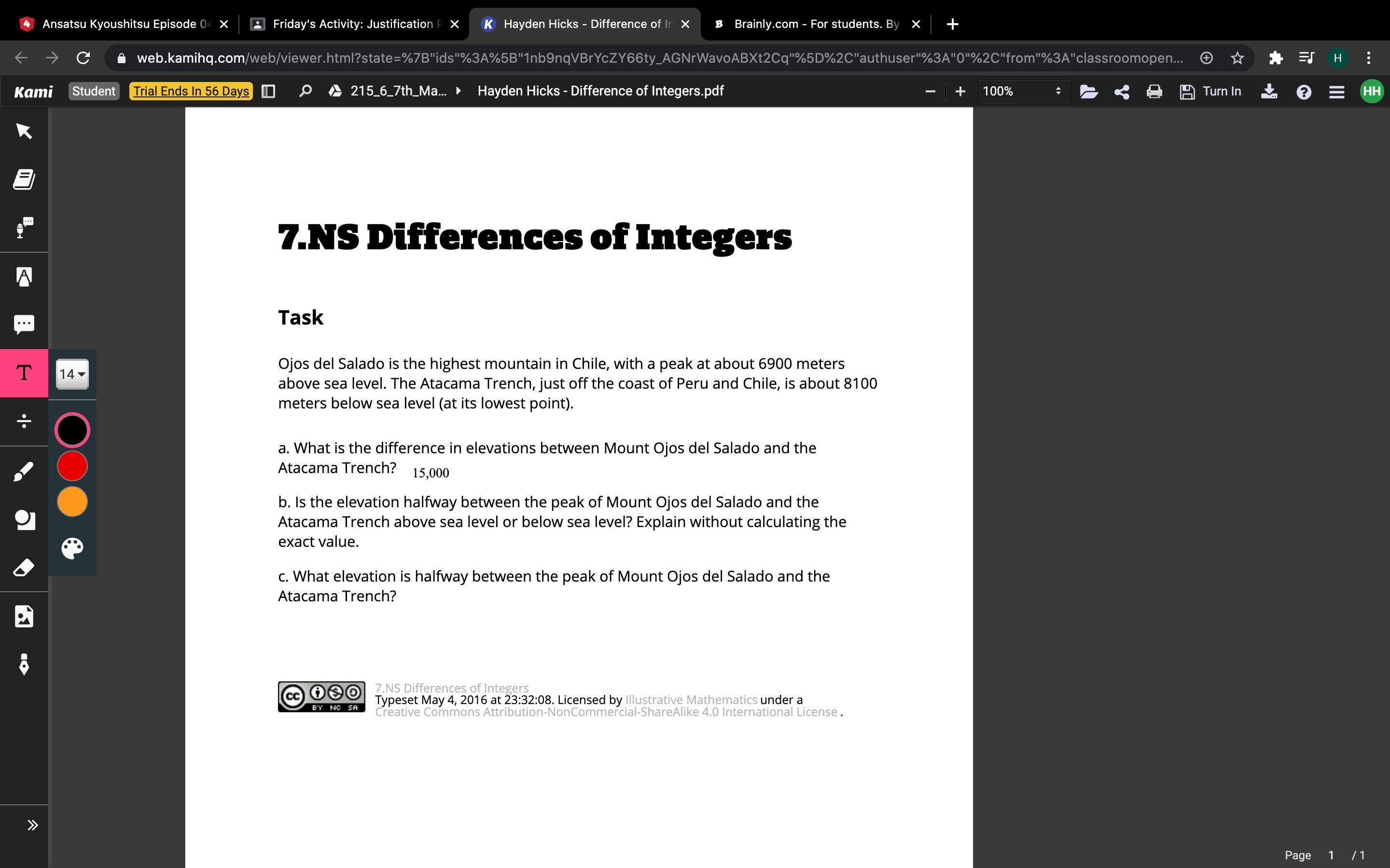 Explain without calculating the exact value. c. What elevation is halfway between the peak of Mount Ojos del Salado and the Atacama Trench?