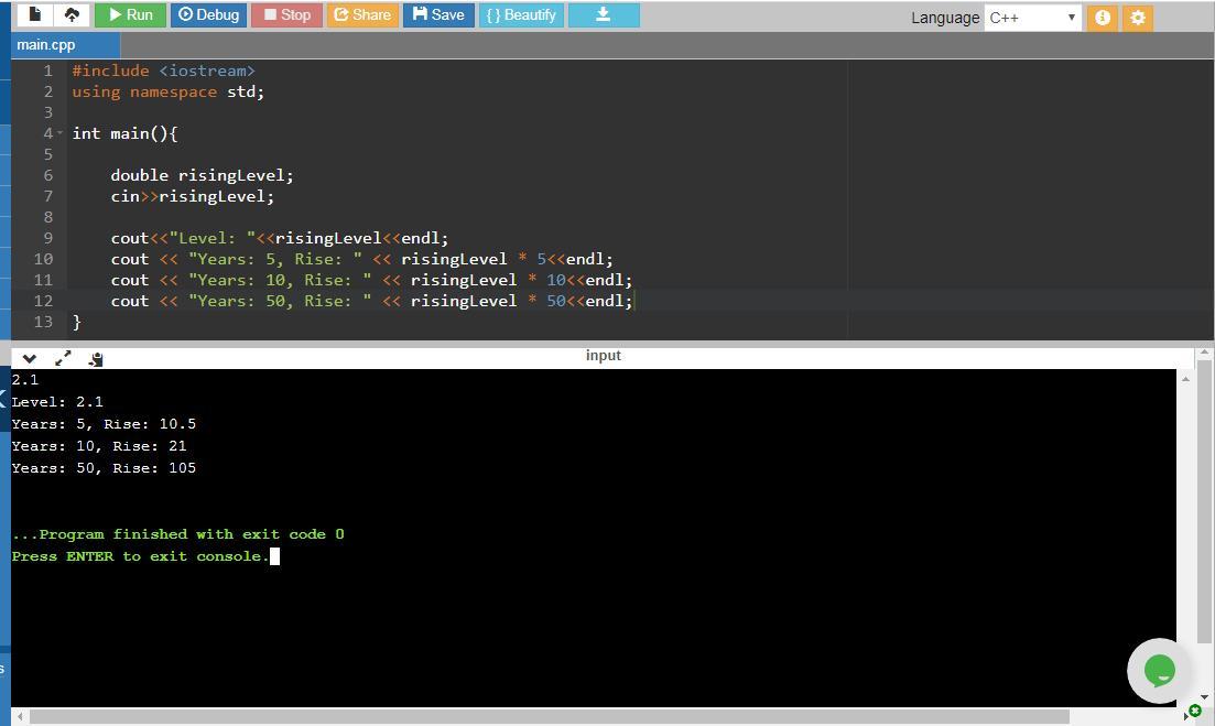 cout << "Years: 50, Rise: " << risingLevel * 50<<endl; //displays the rise in ocean level over 50 years