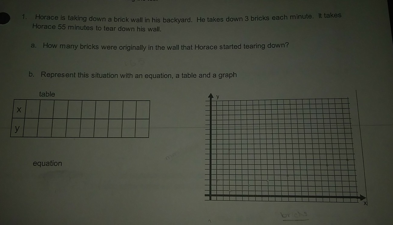 a.) He takes down <u>3 bricks each minute</u>, and it takes him 55 minutes to tear down the wall.