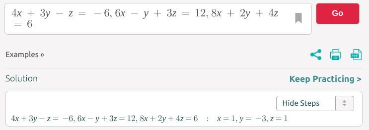 4x + 3y - z = -6 6x - y + 3z = 12 8x + 2y + 4z = 6