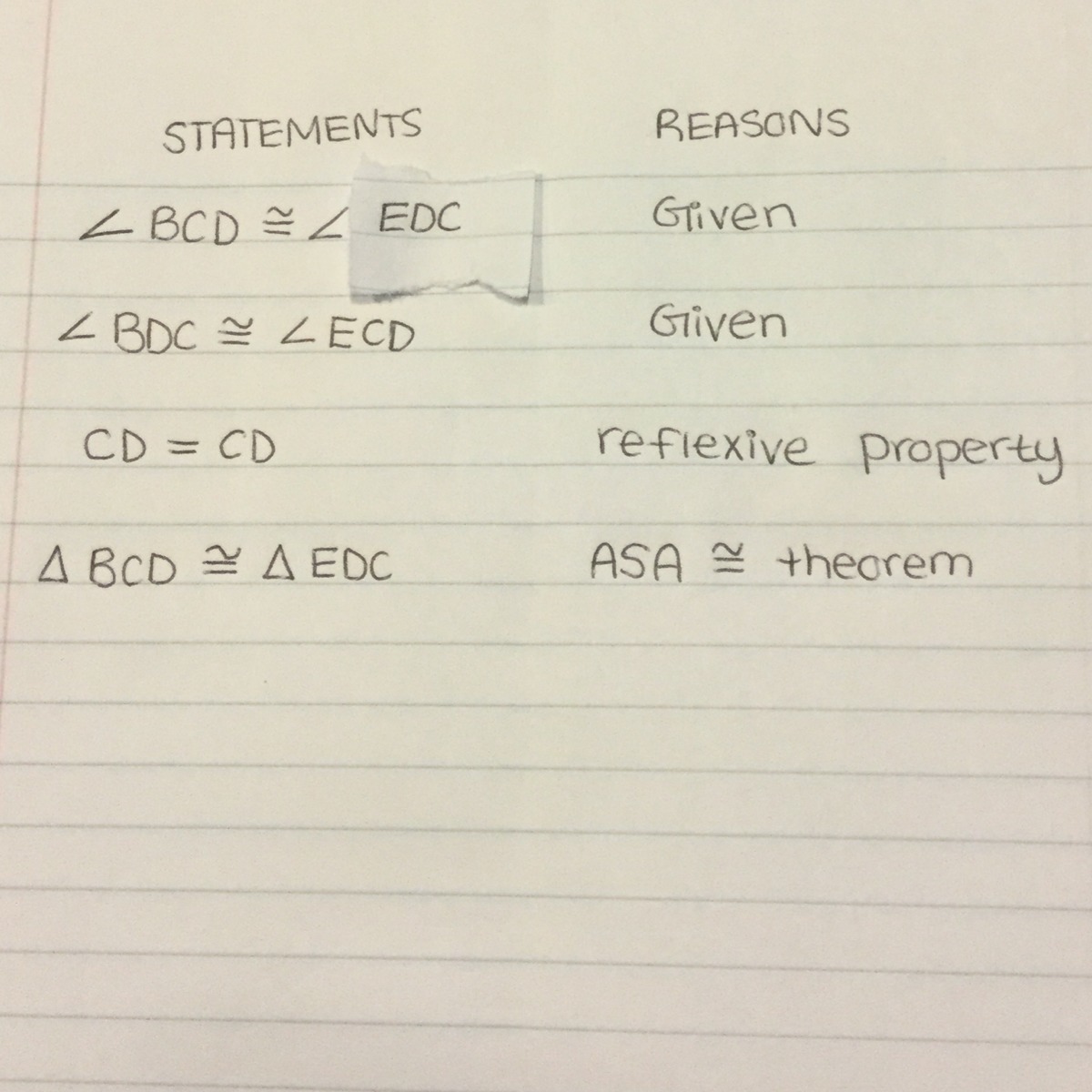 That is, two angles and the side between them of ΔBCD are congruent to the corresponding angles and the side between them of ΔECD.