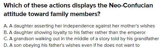 A son obeying his father's wishes even if he does not want to, these actions displays the Neo-Confucian attitude toward family members because son disrespect father.