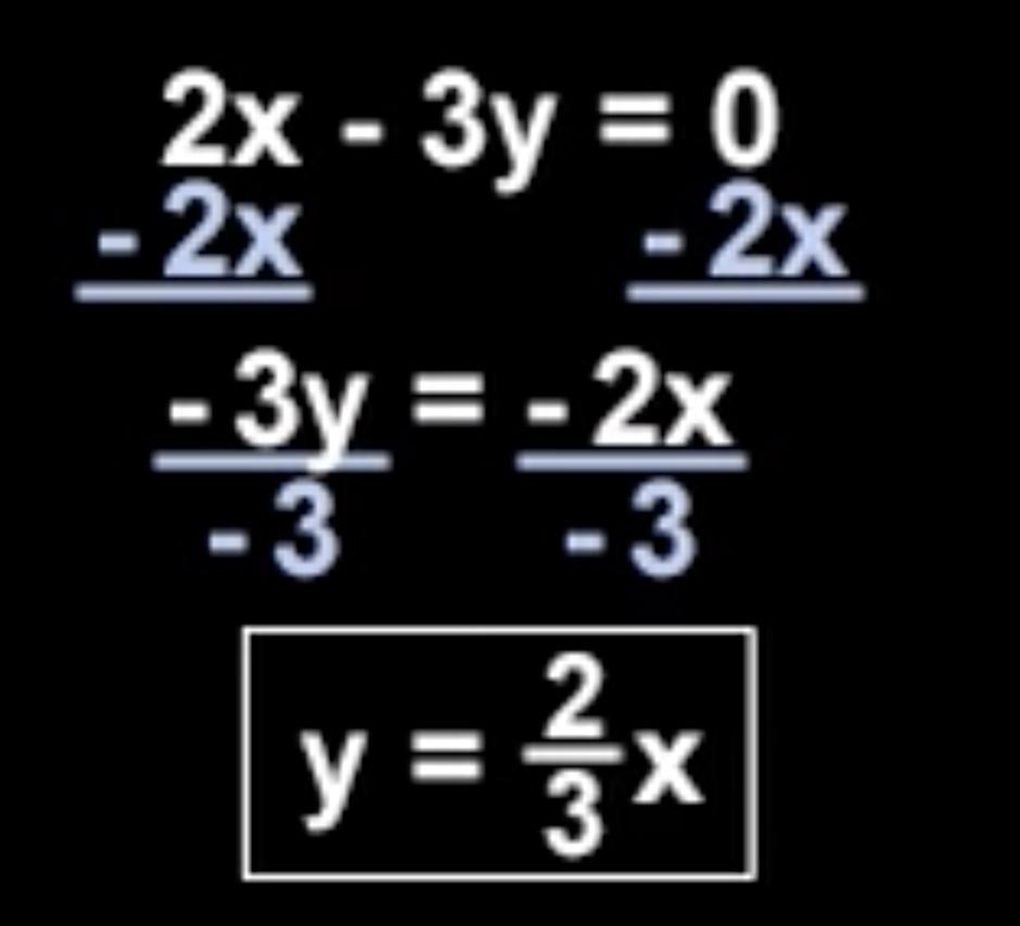 Then we divide both sides by -3 to get <em>y = 2/3x</em>.