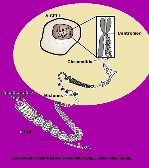 Chromosomes- A chromosome is a thread-like long coil of DNA located inside the nucleus of cells. Each chromosome is made up of a pair of chromatid that is joined at a center known as the centromere with each chromatid being made up of DNA coiled around proteins (often time histone). Chromosomes are passed from parent to off spring during nuclear division.