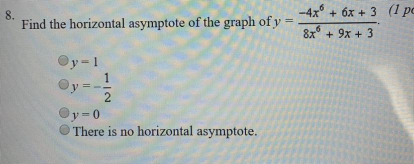 Find the horizontal asymptote of the graph of y = -4x^6 + 6x + 3/8x^6 + 9x + 3