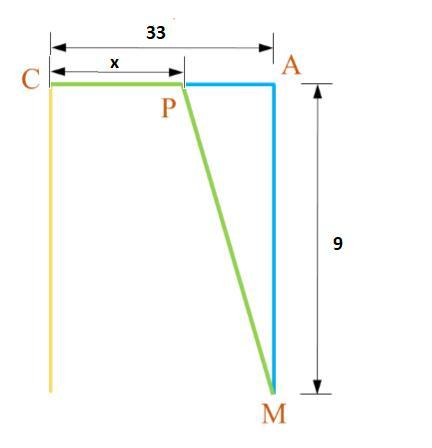 We will use the variable x to express the the length of cable CP and PM, accordingly to the attache picture.