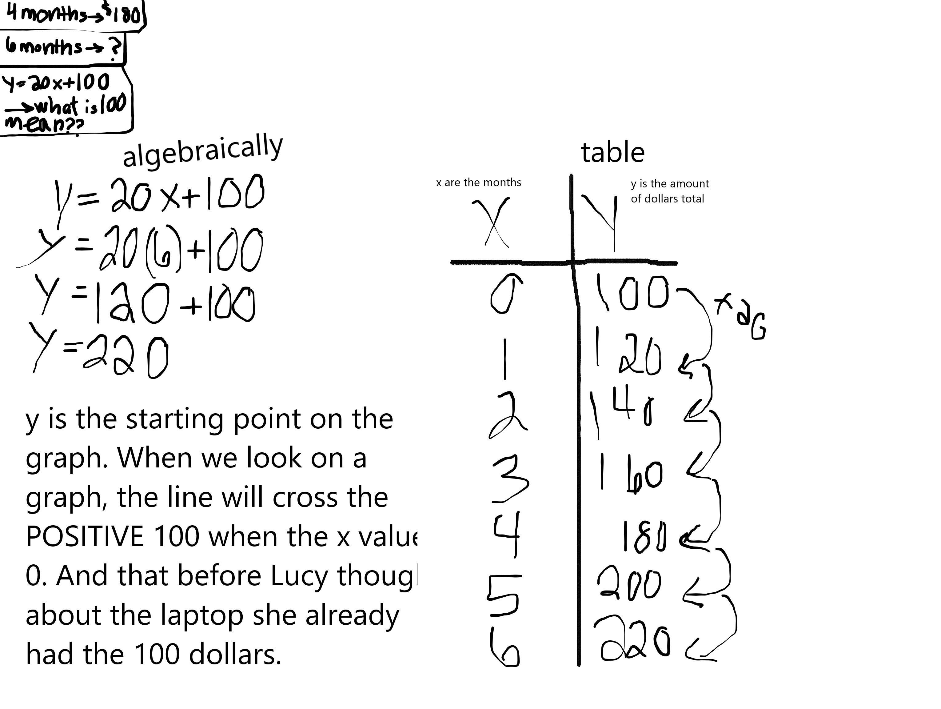 So in other words, what does the 100 represent? Well it represent the y-intercept if we graph this. Or we could say the 100 represent the amount of dollars Lucy had before saving up money for her laptop. We can also include from the linear equation is that Lucy is earning 20 dollars each month!