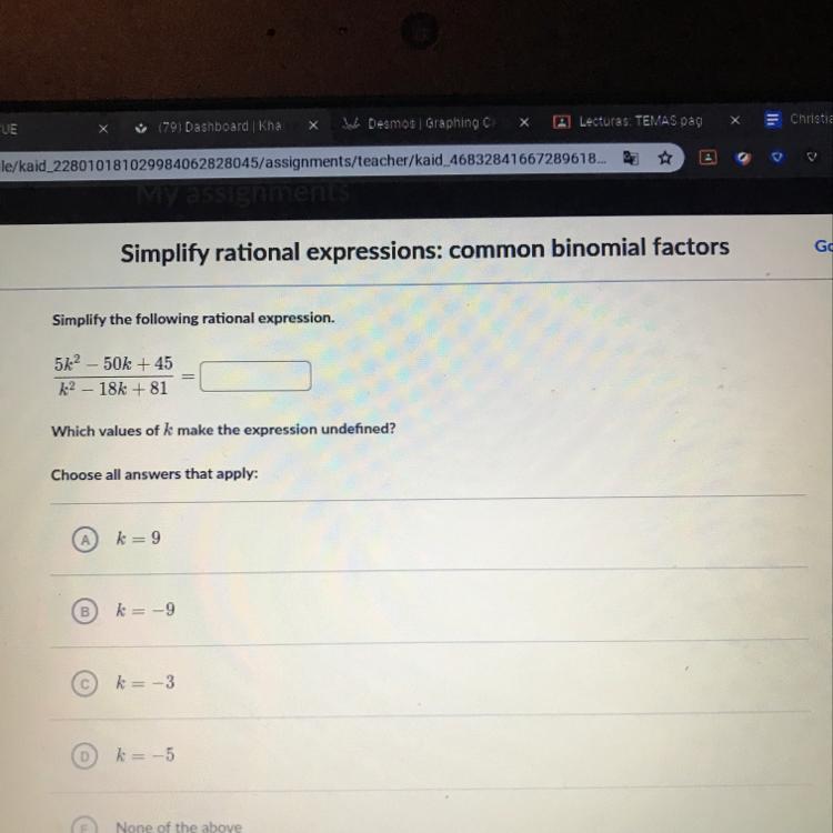 Hence The value of k for the expression to be undefined is 9 . Answer