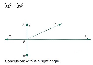 Solution: In order to conclude that RPS is a right triangle, the statement Perpendicular lines meet to form right angles supports than the others given, thus, Option B is correct.
