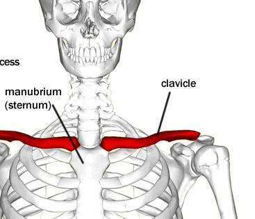 The manubrium is seen as a <u>flat bone</u>at the <u>superior portion of the sternum</u>. It joins the clavicle medially, creating the sternoclavicular joint, by attaching to the <u>clavicular notch</u>. It is the strongest and thickest part of the sternum, which also <u>resembles a handle of a sword</u> (from Latin, <em>manus</em>, meaning <em>handle</em>). Inferior to the sternoclavicular joint, attachments for the first and second rib are present. The manubrium is also attached to the sternum via the sternomanubrial joint.